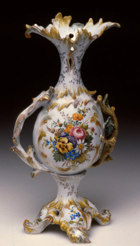 sontuoso vaso da fiori a ventre tondeggiante, alto collo con orlo espanso e supporto, anse a forma di tralcio; decoro policromo