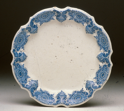 piatto rotondo con cavetto appena accennato, tesa a coste e orlo mistilineo; decoro in monocromia blu lungo i bordi