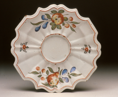 piatto rotondo con tesa a coste e orlo mistilineo, utilizzato come sottotazza; decoro policromo