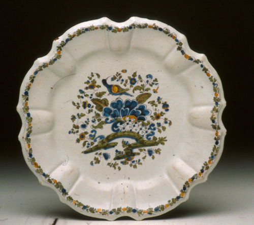 piatto con tesa a coste e orlo mistilineo; decoro policromo