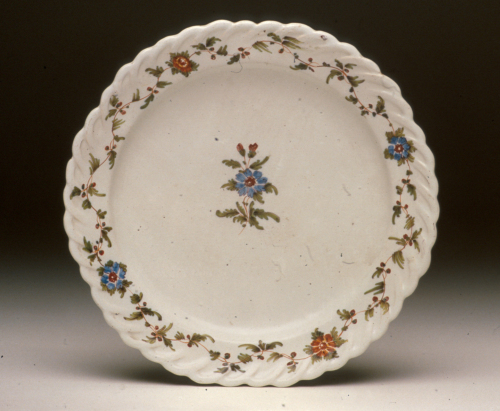 piatto rotondo con cavetto appena accennato e tesa a finto vimini; decoro policromo