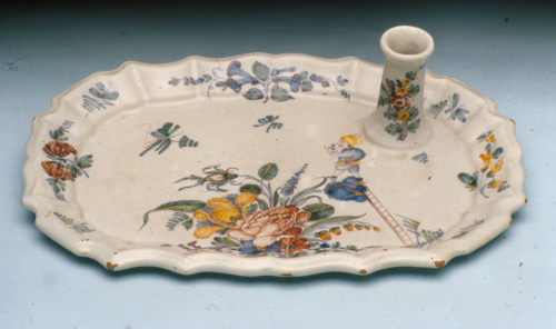 vassoio rettangolare con tesa a coste e orlo mistilineo dotato di calamaio cilindrico; decoro policromo