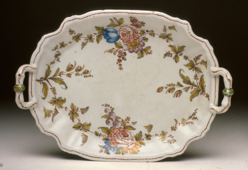 vassoio ovaleggiante con orlo mistilineo e manici rialzati; decoro policromo