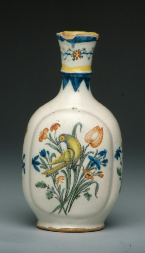bottiglia di piccole dimensioni a corpo schiacciato, collo lungo leggermente svasato; decoro policromo