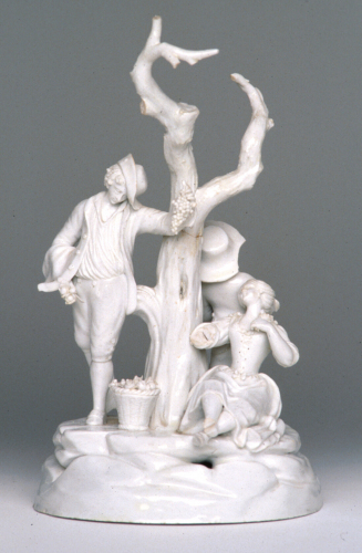 gruppo figurato, bianco, costituito da due contadini e una giovinetta in atteggiamento di riposo, in prossimità di un tronco d'albero