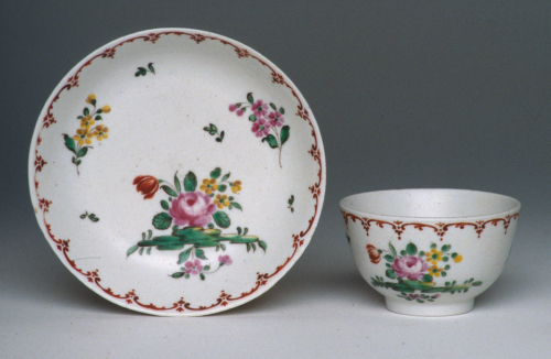 tazzina a coppetta su base ad anello, senza manico; piattino con orlo leggermente rialzato; decoro policromo