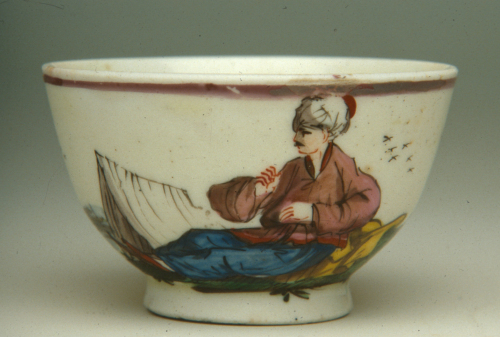 tazzina a coppetta senza manico su base ad anello; decoro policromo