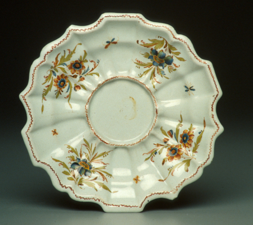 piatto rotondo con tesa a coste e orlo mistilineo, utilizzato come sottotazza; decoro policromo
