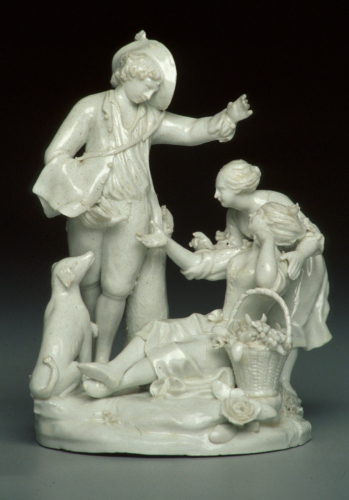 gruppo figurato, bianco, rappresentante una scena agreste con un cacciatore, in piedi e affiancato da un cane, e due giovani contadine, una delle quali semisdraiata e sorretta dall'altra, un canestro di fiori come elemento di contorno