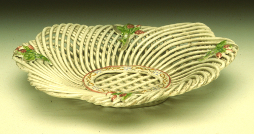 cestino a spaghetto, corpo ad intreccio vimineo; decoro policromo