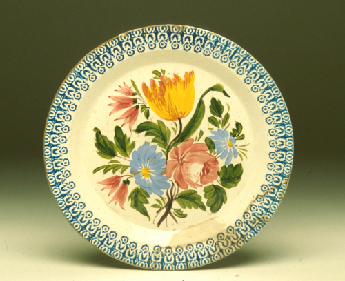 piatto rotondo con cavetto a calotta schiacciata, tesa liscia; decoro policromo