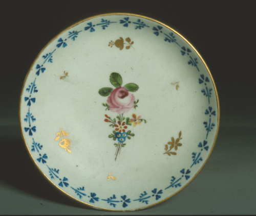 piattino rotondo con orlo rilazato; decoro policromo con dorature