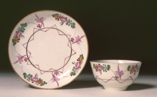tazzina a coppetta senza manico su base ad anello, piatto con orlo liscio leggermente rialzato; decoro policromo