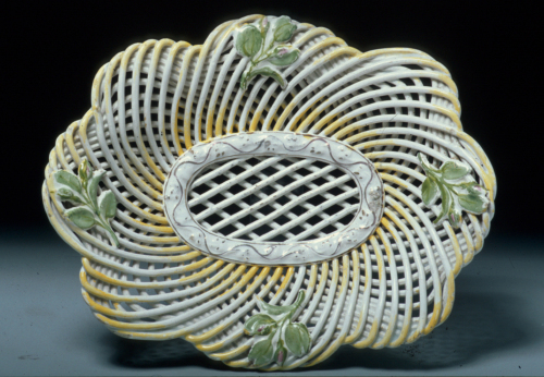cestino ovale a spaghetto, corpo ad intreccio vimineo; decoro policromo