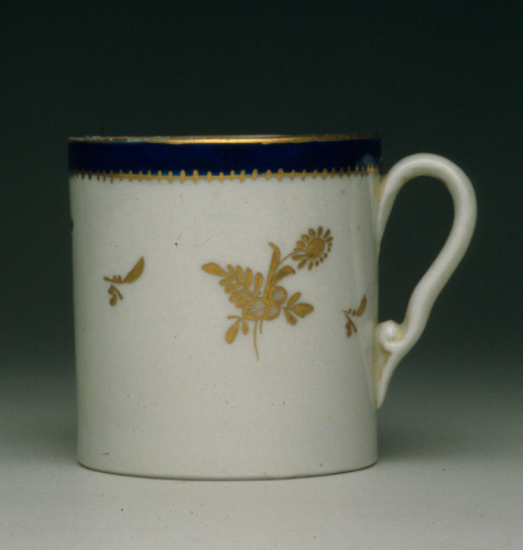 tazzina cilindrica con manico ad orecchio; decoro in blu e oro