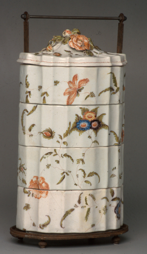 vivandiera divisa in quattro contenitori componibili, con coperchio con decoro plastico e carrello in ferro; decoro policromo