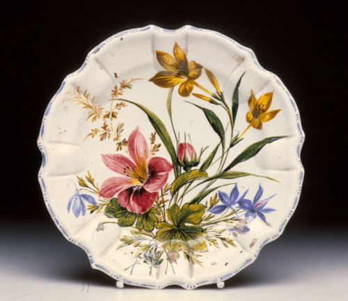 piatto rotondo con tesa a coste e orlo mistilineo; decoro policromo