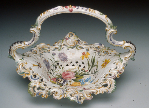 cestino traforato con manico mistilineo; ricco decoro policromo