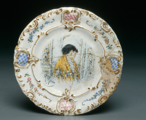 piatto rotondo con ampia tesa; decoro policromo