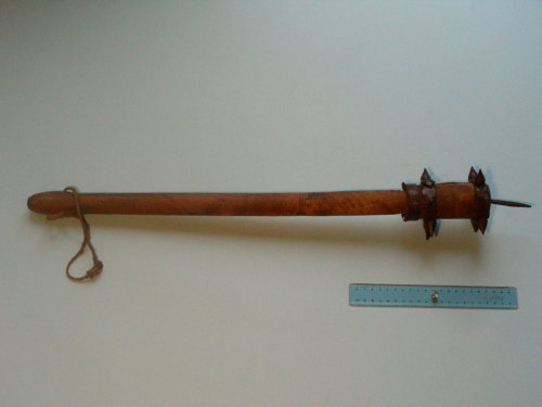 testa con due anelli in ferro. Il superiore ha inseriti sei puntoni conici, fissati a ribattitura. L'anello inferiore ne porta quattro. Due sono stati sostituiti con rimedi estemporanei perchè forse danneggiati. Anelli fissati con viti a legno su una banda di rinforzo in ferro incassata nel legno, che fissa uno spuntone a sezione quadra in asse con l'impugnatura. Bande di rinforzo trattenute alla base della testa da anello di ferro. Impugnatura con testata ingrossata munita di correggiolo in corda.