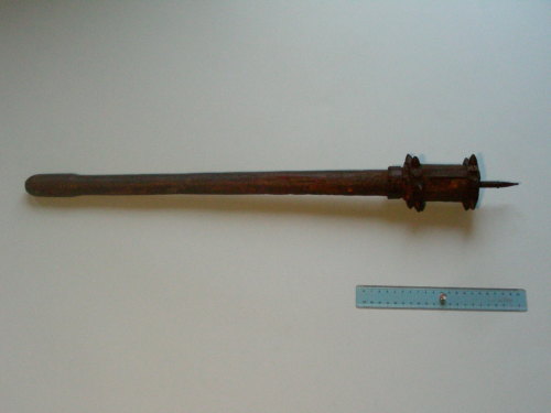 testa con due anelli in ferro, ciascuno dei quali munito di sei puntoni conici, fissati a ribattitura. Anelli fissati con viti a legno su una banda di rinforzo in ferro incassata nel legno, che fissa uno spuntone in asse con l'impugnatura. Le viti dell'anello superiore sono evidentemente un'aggiunta moderna. Bande di rinforzo trattenute alla base della testa da anello di ferro. Impugnatura con testata ingrossata