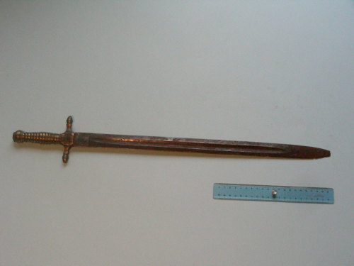 lama dritta a doppio filo con sguscio centrale su entrambi i lati. Fornimento in unico pezzo con l'impugnatura. Guardia a croce con rami terminanti con ghiande. Impugnatura con scanalature di presa e pomo. Anomala rondella di ferro che trattiene il codolo, ribattuto.