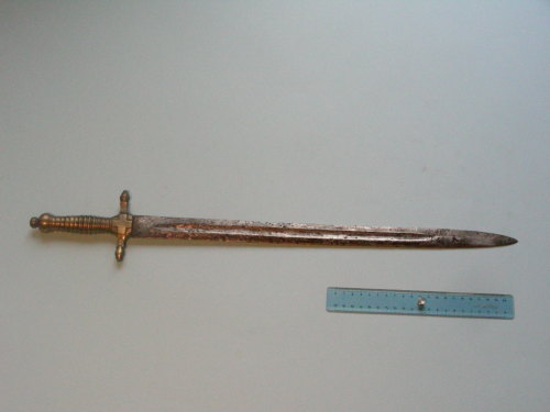 lama dritta a doppio filo con sguscio centrale su entrambi i lati. Fornimento in unico pezzo con l'impugnatura. Guardia a croce con rami terminanti con ghiande. Impugnatura con scanalature di presa e pomo. Bottone che trattiene il codolo, ribattuto.
