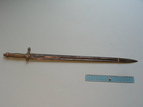 lama dritta a doppio filo con doppio sguscio centrale su entrambi i lati. Fornimento in unico pezzo con l'impugnatura. Guardia a croce con rami terminanti con ghiande. Impugnatura con scanalature di presa e pomo.