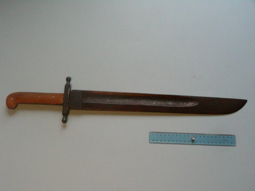 lama dritta con un solo sguscio sul lato destro. Punta al dorso molto arrotondata. Guardia a croce. Impugnatura sagomata con forte piega alla coccia
