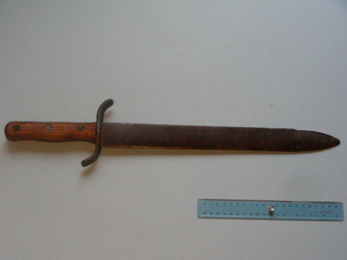 lama dritta molto spessa ad un filo. Punta al centro con controfilo. Guardia a crociera ad "S". Impugnatura dritta, a due guancette, ingrossata al centro e con nocca arrotondata