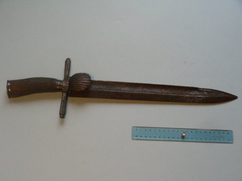 lama dritta molto spessa ad un filo. Sguscio fino alla punta sul lato destro. Lato sinistro liscio. Punta al centro con controfilo. Guardia a crociera dritta. Pelta a conchiglia alla destra. Impugnatura con cappetta e ghiera di ferro.