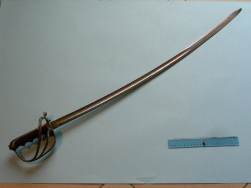 Lama curva a filo, punta e controfilo; sgusciature sui due lati per i primi tre quarti, per l'ultimo quarto doppio sguscio con punta ribassata alla pandura; incisa ad acido per tre quarti a motivi militari e floreali; motivo floreale anche sul dorso. Fornimento tipico con guardia e due elsi. Corto ramo di parata a riccio con conchiglia per il pollice. Cappetta lunga, arrotondata, con dorso zigrinato nell'ultimo quarto. Bottone piatto, ovale, avvitato al codolo. Impugnatura anatomica.