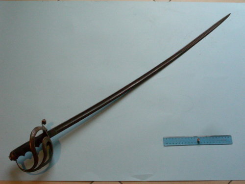 Lama leggermente curva a filo, punta e controfilo; sgusciatura sui due lati per i primi tre quarti; per l'ultimo quarto doppio sguscio con punta al centro. Incisa ad acido per metà a motivi militari e floreali. Fornimento con guardia e due elsi di piccolo spessore. Corto ramo di parata a riccio con conchiglia per il pollice sul piatto di guardia. Cappetta lunga, arrotondata, con dorso zigrinato nell'ultimo quarto. Bottone piatto, ovale, avvitato al codolo. Impugnatura anatomica.