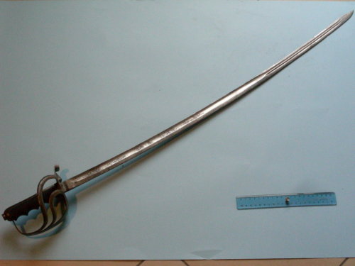 Lama leggermente curva a filo, punta e controfilo; sgusciatura sui due lati per i primi tre quarti; per l'ultimo quarto doppio sguscio con punta ribassata alla pandura. Incisa ad acido per metà a motivi militari e floreali. Motivo floreale anche sul dorso. Fornimento con guardia e due elsi di piccolo spessore. Corto ramo di parata a riccio con conchiglia per il pollice sul piatto di guardia. Cappetta lunga, arrotondata, con dorso zigrinato nell'ultimo quarto. Bottone piatto, ovale, avvitato al codolo. Impugnatura anatomica.