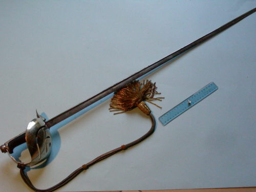 Lama dritta, a facce parallele, a dorso tondo; punta simmetrica al centro con accenno di Jelman; liscia. Incisioni ad acido a motivi militari e floreali fino a metà lama; incisioni a motivi floreali anche sul dorso. Fornimento con guardia a quattro elsi e ramo di parata ricavato dal prolungamento del piatto di guardia; è presente la conchiglia per il pollice. Cappetta lunga, zigrinata in testa e alla ghiera. Bottone ovale avvitato al codolo. Impugnatura liscia. E' presente anche la dragona.