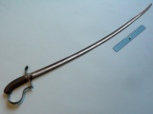 Lama curva; sguscio centrale fino al debole. Incisioni al cesello a motivi militari e floreali fino a un quarto della lama. Punta ribassata alla pandura. Guardia piena ad un solo elso, con ampia ansa; elso di parata a ricciolo, integrato con la guardia. Cappetta stondata liscia. Bottone ovale arrotondato avvitato al codolo. Impugnatura rivestita, sagomata a settori. Alette fermafodero semicircolari.