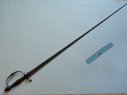 Lama dritta, a tre fili, decorata al cesello fino a un sesto. Punta simmetrica al centro. Fornimento in unica fusione comprendente il ramo di guardia, il ramo di parata, il bocchetto con due archetti e la base. Impugnatura a fusetto decorata con sferette. Pomo sferico decorato con base a capitello e bottone ribattuto al codolo.