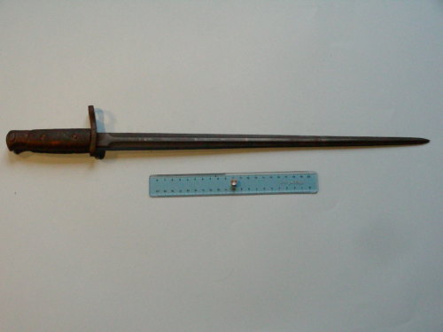Lama dritta, a croce, senza fili. Guardia ad anello. Impugnatura con guancette trattenute da spinotti passanti. Sistema di aggancio a pulsante.