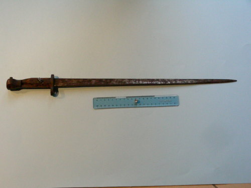 Lama dritta, a spada, punta a doppio filo. Guardia ad anello. Impugnatura con guancette trattenute da spinotti passanti. Sistema di aggancio a pulsante.