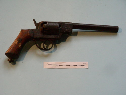Castello aperto; tamburo fisso ad avancarica a sei cartucce. Canna cilindrica rigata; tacca sulla testa del cane. Apertura del castello sul lato destro per l'inserimento delle capsule sui luminelli. Presente il ponticello; coccia con anello per correggiolo. Castello, tamburo e canna decorati ad incisione a motivi floreali.