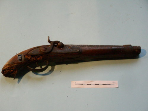 A una canna; ad avancarica, con acciarino molla avanti; liscia. Canna fissata alla cassa in volata con fascetta di ferro aggiunta per sopperire alla rottura del fissaggio originale a spine ed anelli, e con vite al codolo. Accensione a luminello. Canna decorata ed ageminata; impugnatura decorata con scudetto contenente una testa di profilo.