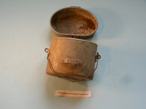 Manico in tondino inserito in due occhielli laterali fissati con rivetti. Coperchio con manico e placca di aggancio. Seconda placca sul corpo della gamella.