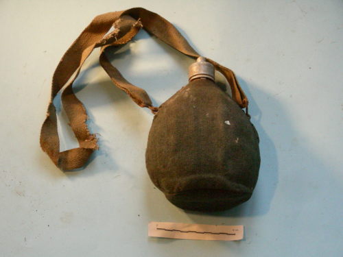 Tappo a vite zigrinato fissato al corpo con catenella metallica; telino grigio-verde cucito. Corpo principale scanalato; due anelli laterali per il fissaggio della tracolla, presente.