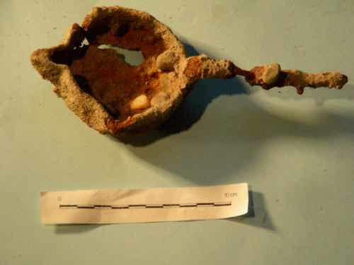 Piatto circolare con due beccucci e manico.