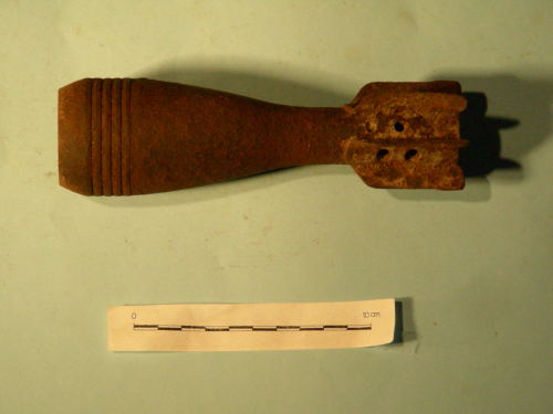 Involucro cilindrico scanalato in testa con sei impennaggi con due fori ciascuno.