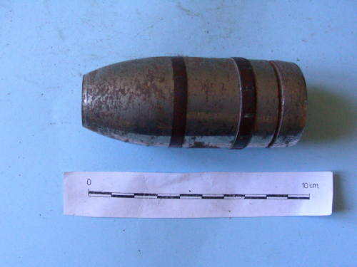 A forma cilindrica, e a tronco di cono nella parte superiore; foro all'apice, filettato all'interno; ulteriore foro filettato a metà del corpo principale. Conserva corona di forzamento e ulteriore corona superiore.
