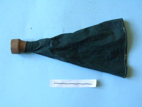 Impugnatura a bastone tornito con ingrossamento forato in testa e pomello in coda; gonnellino di colore verde fissato alla testa del bastone con quattro chiodi