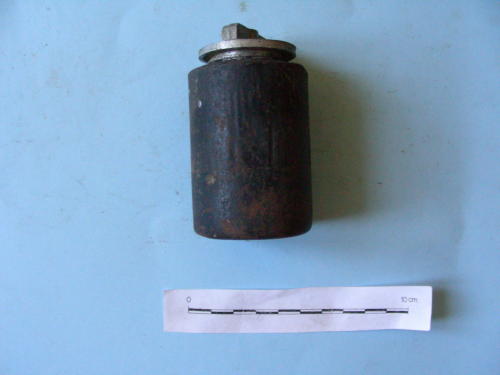 Testata interna cilindrica, vuota, con foro centrale sulla sommità e coperchio circolare filettato con falso detonatore.