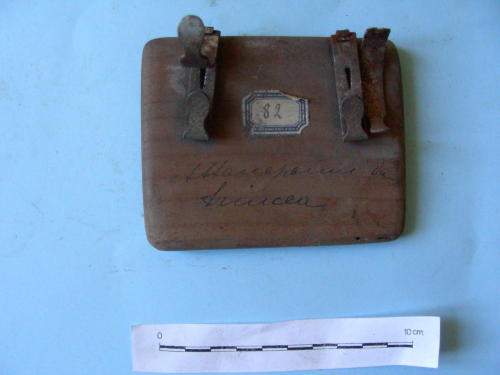 Di forma rettangolare, con due ganci metallici basculanti fissati con due chiodi.
