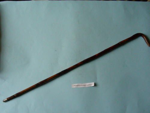 Impugnatura ricurva, puntale metallico arrotondato. Parte lignea modellata ad imitazione di canna di bambù. Anima con lama a sezione triangolare, priva di filo, con punta al centro e sguscio centrale; decorazioni floreali ad acido nel secondo quarto di lama; bottone di chiusura al manico.